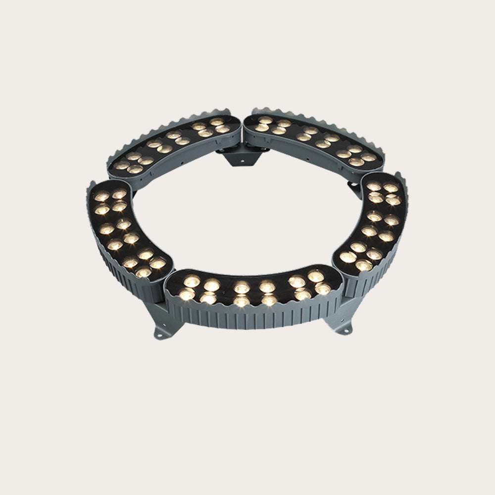 This outdoor tree spotlight spans multiple light segments arranged in a circular form to softly illuminate trees or shrubs. Crafted from aluminium with tempered-glass lenses and rated IP65, it withstands wet weather while creating a subtle wash of warm LED light—ideal for late-evening garden ambience and highlighting natural texture under soft illumination.